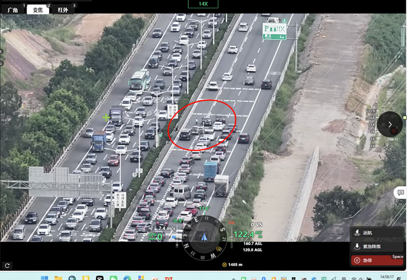 例如,10月1日14時(shí)56分,大有園立交松山湖收費(fèi)站無人機(jī)發(fā)現(xiàn)莞深高速-G94公路形成擁堵,無人機(jī)快速前出核查擁堵原因。14時(shí)58分,無人機(jī)發(fā)現(xiàn)擁堵源頭“快速路四車碰撞,導(dǎo)致道路擁堵”,并同步將事件發(fā)生位置、事件類型等信息發(fā)送至高速公路信息服務(wù)中心(指揮中心)進(jìn)行救援處置力量的調(diào)度指揮。14時(shí)59分,無人機(jī)前出至事件發(fā)生地上方,懸停飛行進(jìn)行疏導(dǎo)喊話,持續(xù)提示后續(xù)車流減速行駛并向右規(guī)避。